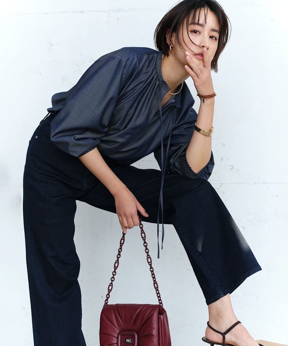 デニムはカジュアルな素材のため、品のある小物を取り入れることによってラフさを抑え、全体のバランスを格上げし大人上品な印象に。