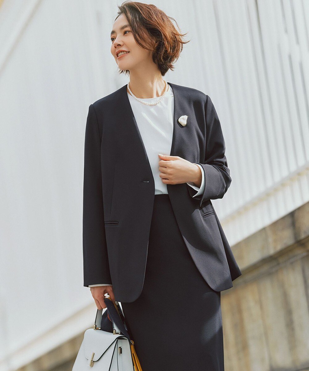 デイリーに着まわせるノーカラージャケットながら、ビジネスからセレモニーまで着れる優秀ジャケット。